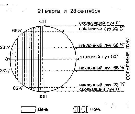 Равноденствие (весеннее равноденствие и осеннее равноденствие) – моменты, когда солнечные лучи касаются обоих полюсов, и отвесно падают на экватор.