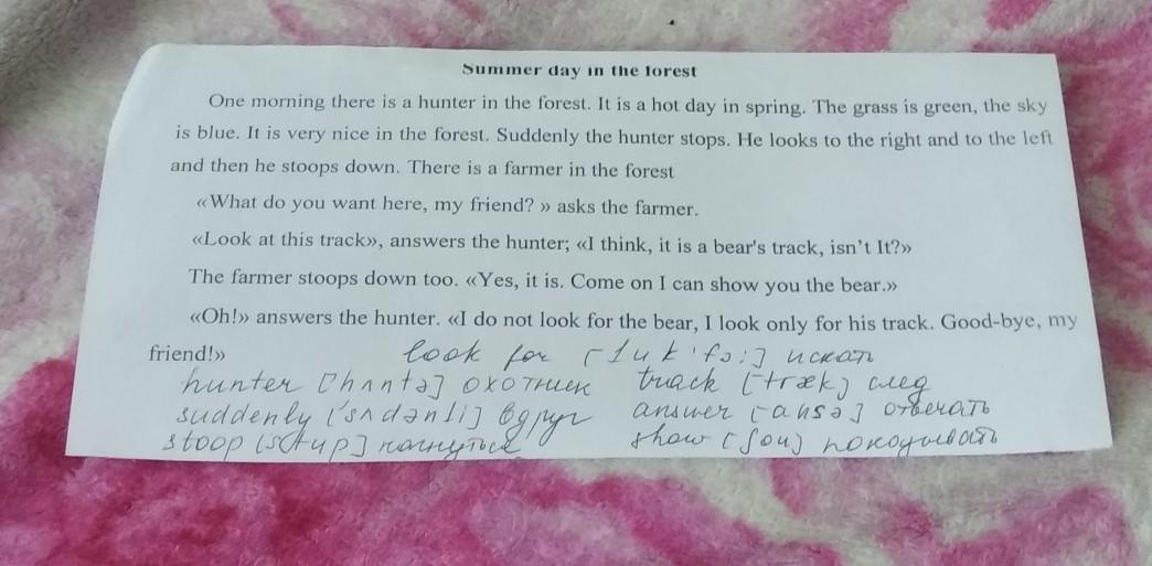 Однажды утром в лесу находился охотник. Был жаркий весенний день. Трава зеленая, небо голубое. Было замечательно в лесу. Внезапно охотник останавливается. Он смотрит сначала направо, налево, затем он нагнулся. В лесу находится ещё фермер.