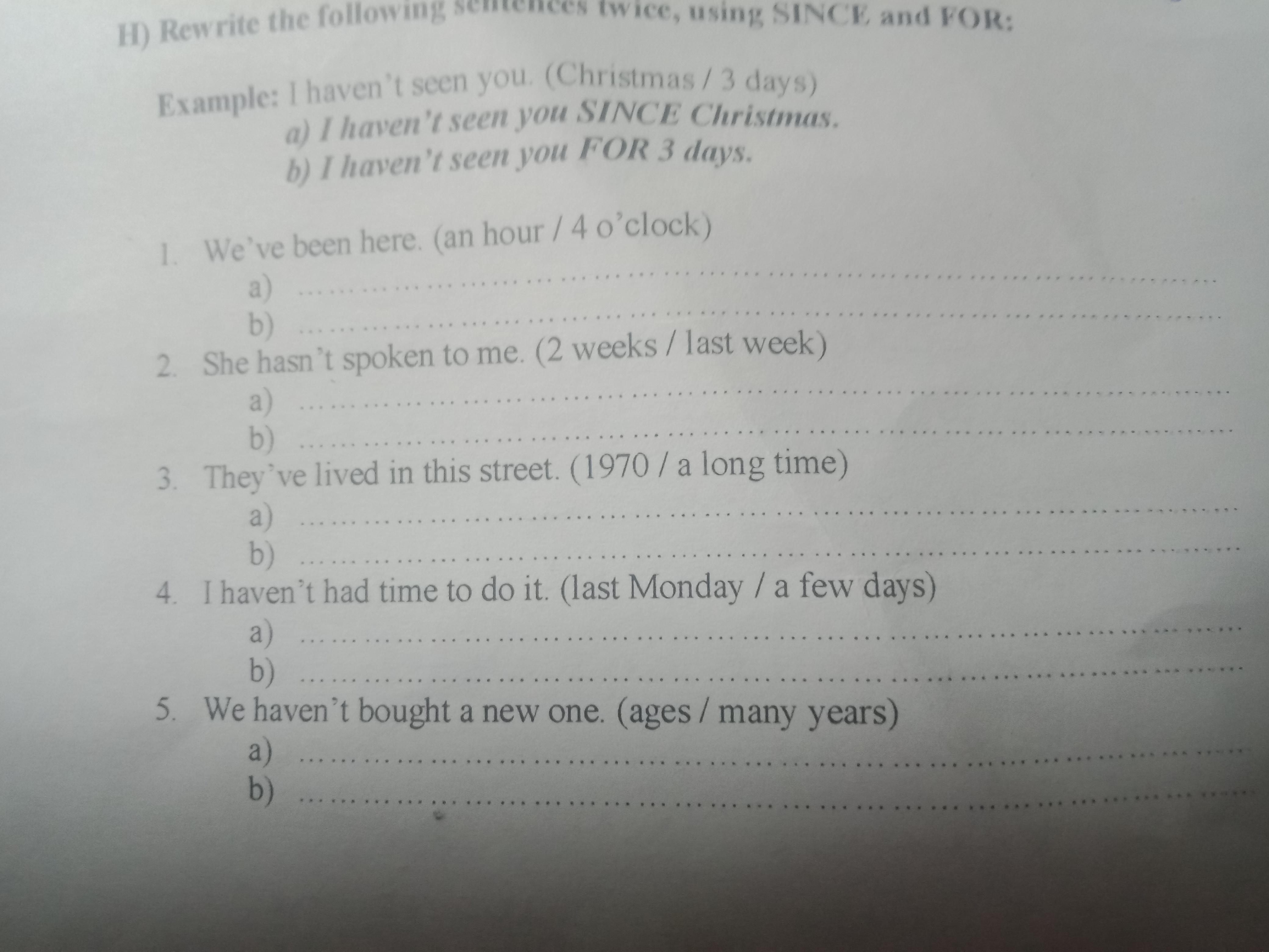 2. She hasn’t spoken to me for 2 weeks. She hasn’t spoken to me since last week 3 They’ve lived in this street since 1970. They’ve lived in this street for a long time. 4 I haven’t had time to do it since last Monday. I haven’t had time to do it for a few days. 5 We haven’t bought a new one for ages. We haven’t bought a new one since many years.