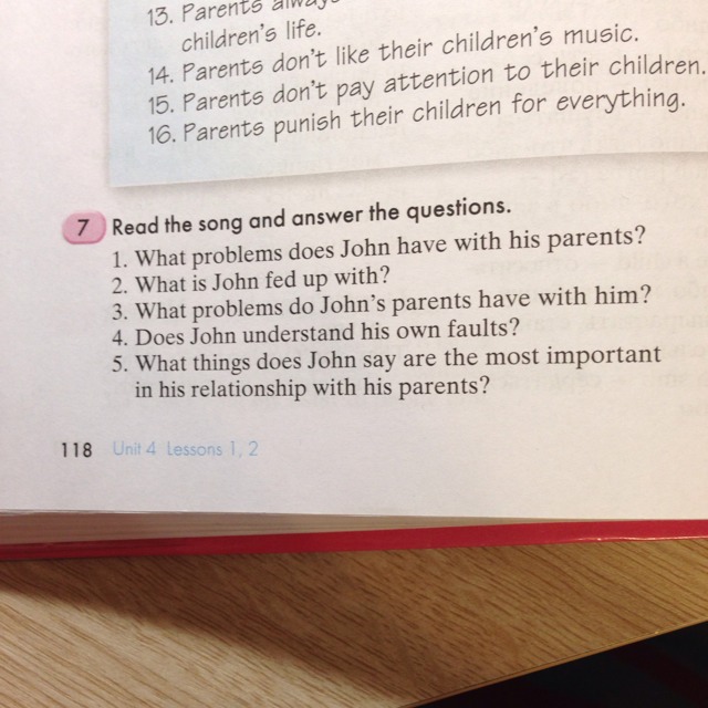 1. John would like his parents to accept his music, his clothes and his friends.2. John doesn't want his parents to nag him for days if he comes home late. 3. John's parents would like him to follow their choice. 4. John' s parents don't want John to disobey. 5. John complaints that his parents don't understand a thing about respect.