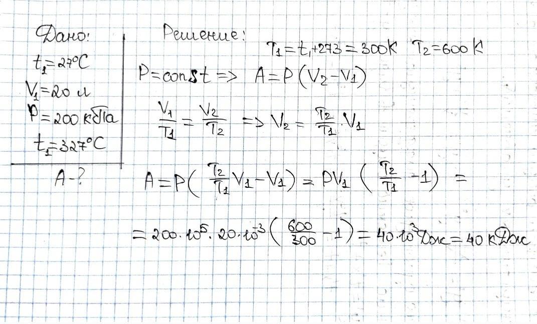 При температуре 27° С газ занимал объём 20л. Какую работу расширяясь совершит газ при давлении 200кПа, если его нагрели до 327 °С?