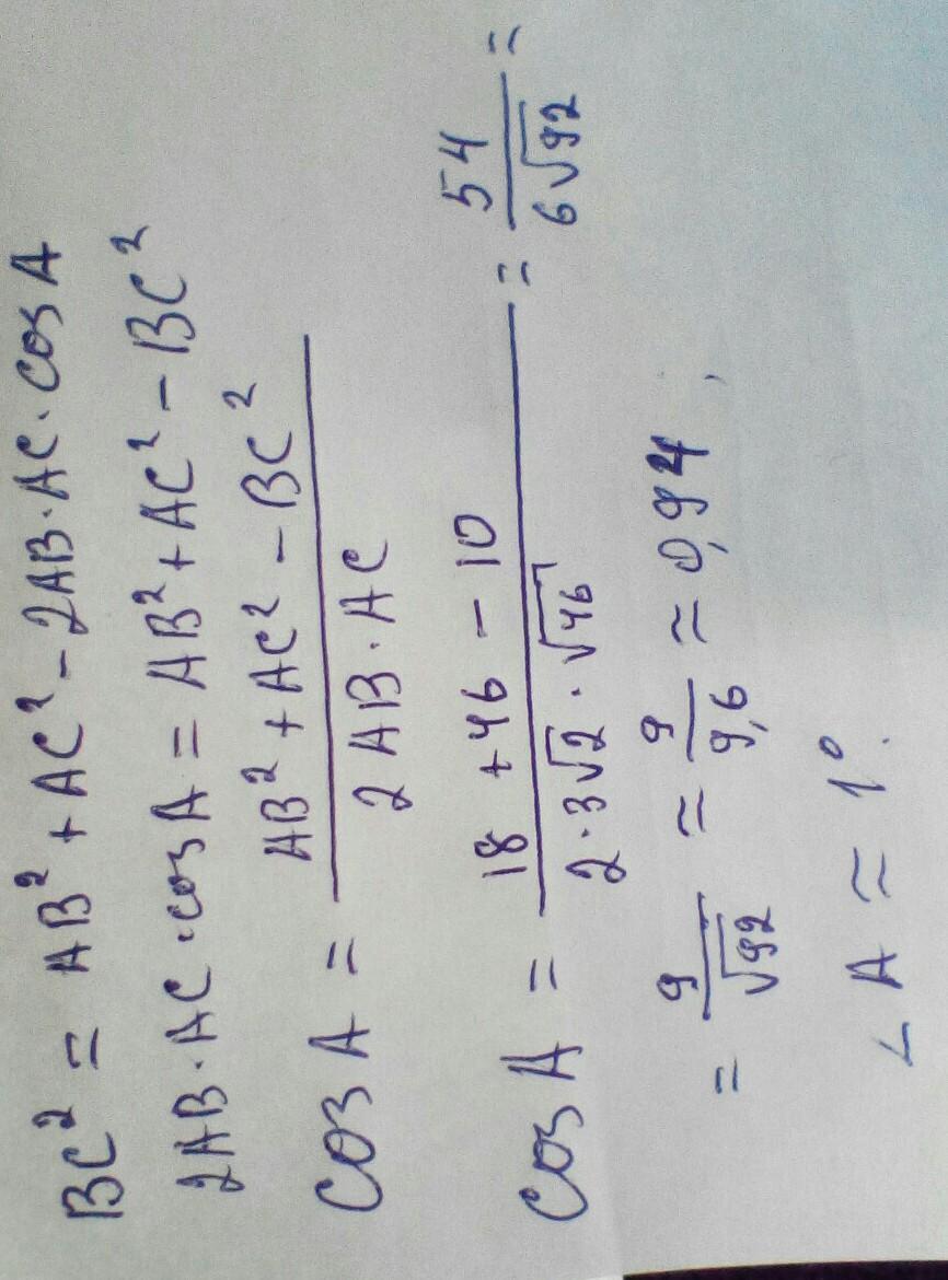 cos∠A = (АВ² + АС²-ВС²) /2·АВ·АС