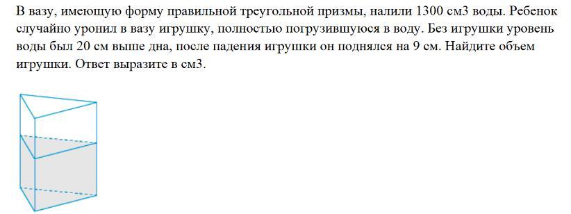 В вазу, имеющую форму правильной треугольной призмы, налили 1300 см3 воды. Ребенок случайно уронил в вазу игрушку, полностью погрузившуюся в воду. Без игрушки уровень воды был 20 см выше дна, после падения игрушки он поднялся на 9 см. Найдите объем игрушки. Ответ выразите в см3.