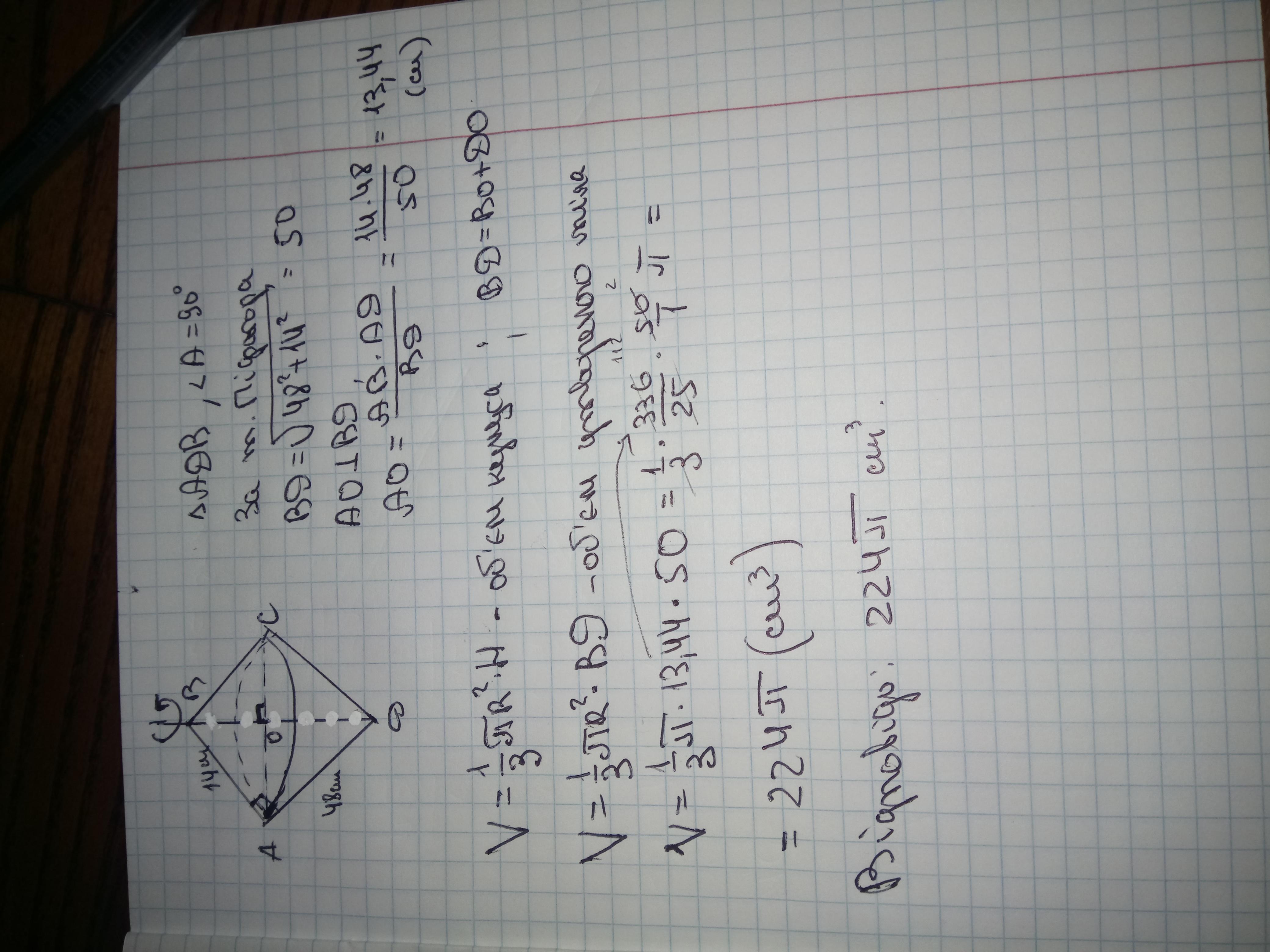 Прямокутний трикутник з катетами 14 см і 48 см обертається навколо гіпотенузи. Обчислити об’єм утвореного тіла.