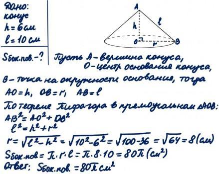 r=√(36/Π)=(6√Π) /Π... S=Π*r*l=Π*(6√Π)/Π*10=6√Π•10=60√Π см²