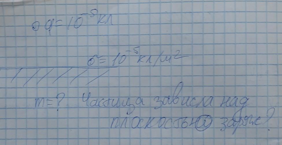 m=σ/(2εε0g)*q=1e-5/(2*1*8,85e-12*10)*1e-5=0,56 кг