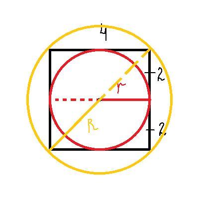 Из рисунка видно, что радиус вписанной окружности равен половине стороны квадрата, т.е. двум сантиметрам, значит