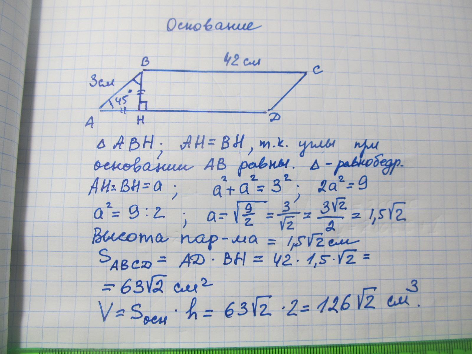 см і 42 см, а кут між ними - 45°. Висота паралелепіпеда дорівнює 2 см.