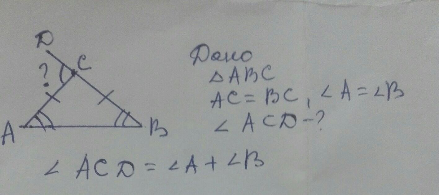внешний угол при любой вершине треугольника равен сумме двух внутренних углов, не смежных с ним