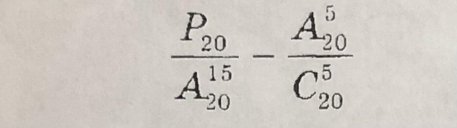 P₂₀/A₂₀¹⁵ -A₂₀⁵/C₂₀⁵=20!/(20!/(20-15)!) -(20!/(20-5)!)/(20!/(5!·(20-5)!))=20!·5!/20! -20!/15! ·(5!·15!)/20!=5!-5!=0