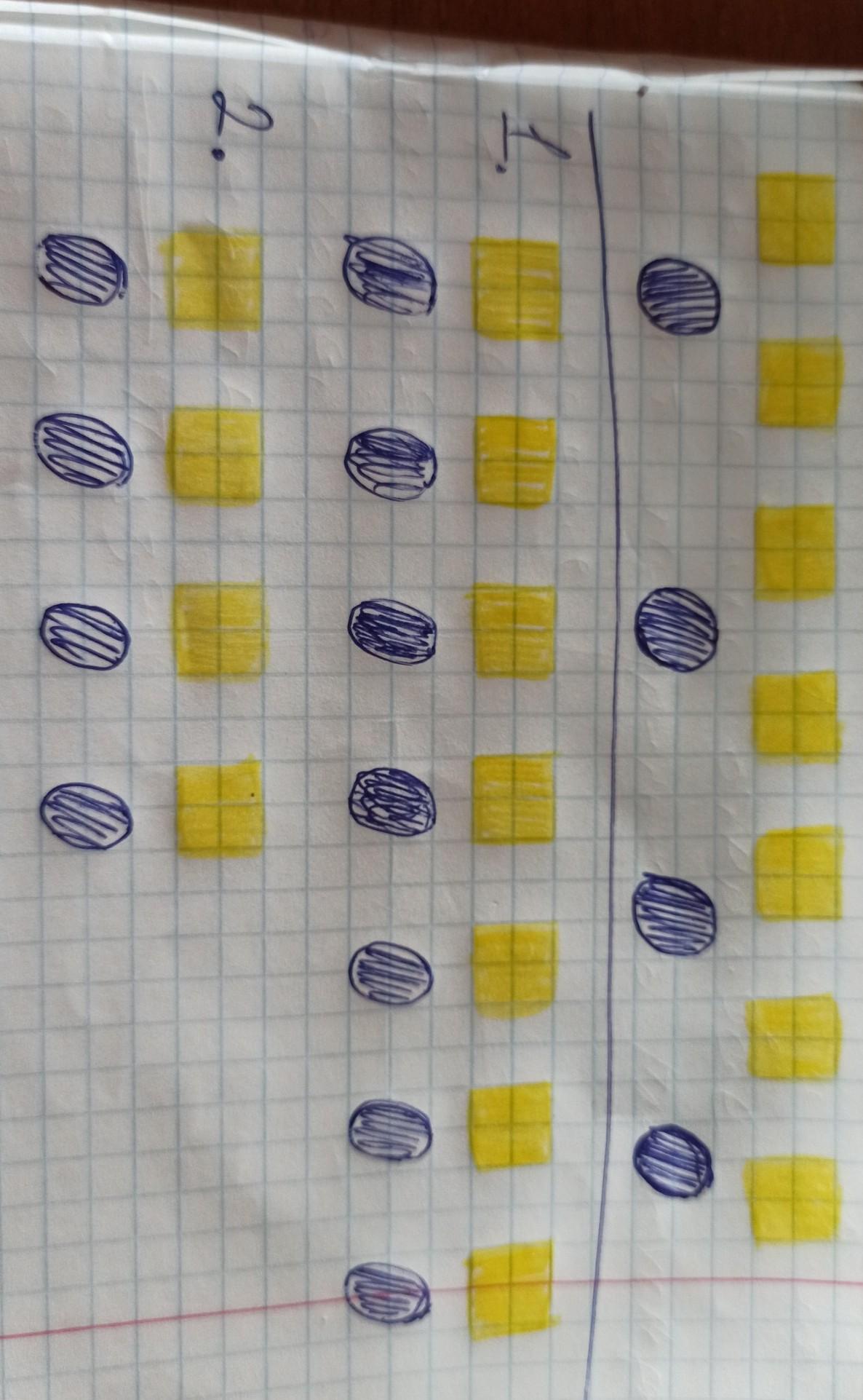 изначально мы имеем 7 квадратов. и на 3 кружка меньше. значит нам нужно 7-3=4. выходит нам нужно нарисовать 4 кружка. в основной умове имеем 7 квадратов и 4 кружка.