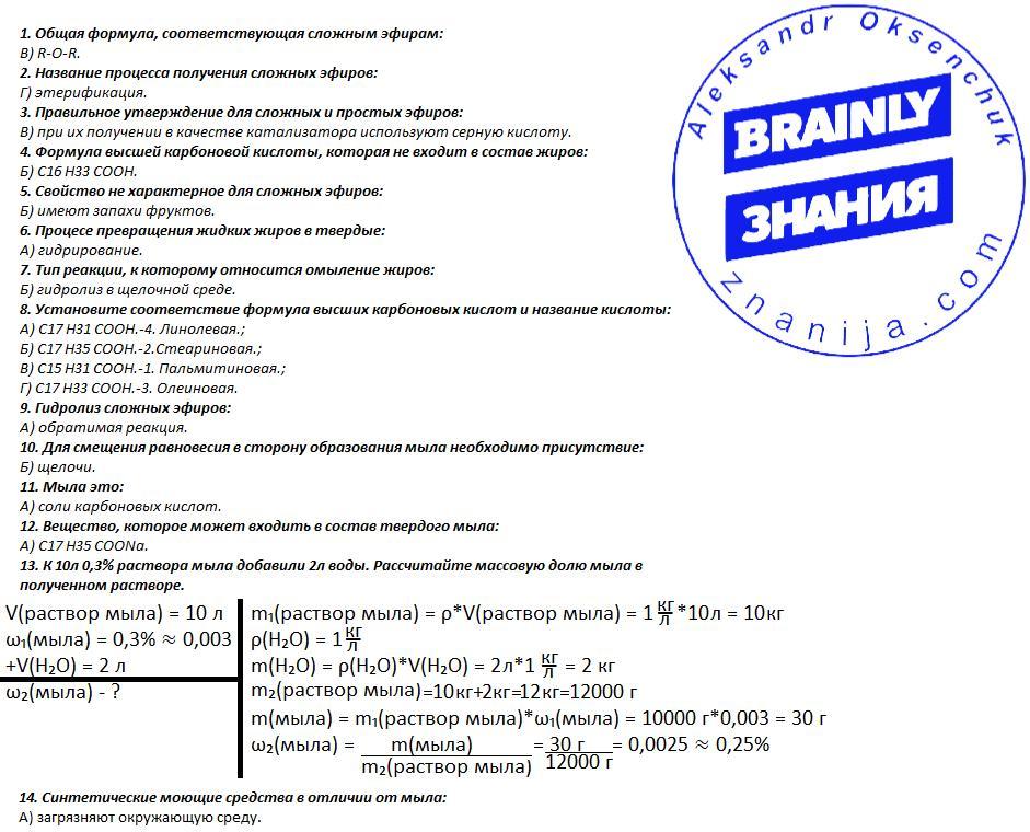 13. К 10л 0,3% раствора мыла добавили 2л воды. Рассчитайте массовую долю мыла в полученном растворе.