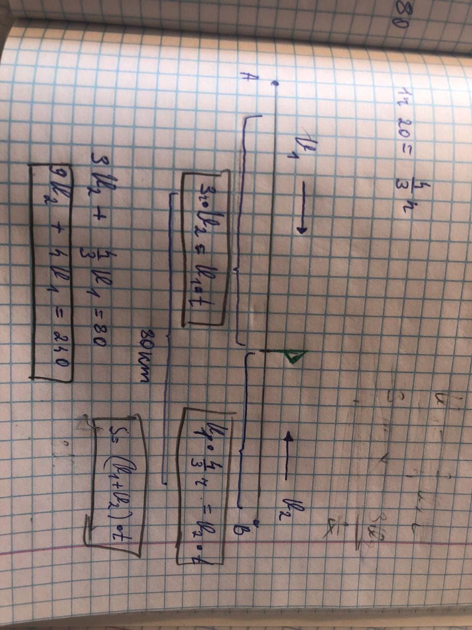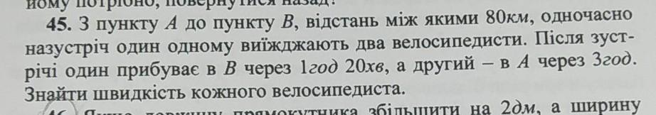 З пункту А в пункт В між якими 80км, одночасно назустріч один одному виїхали два велосипедисти. Після зустрічі перший велосипедист прибуває у В через 1 год 20 хв, а другий в А через 3 год. З якою швидкість їхали велосипедисти?