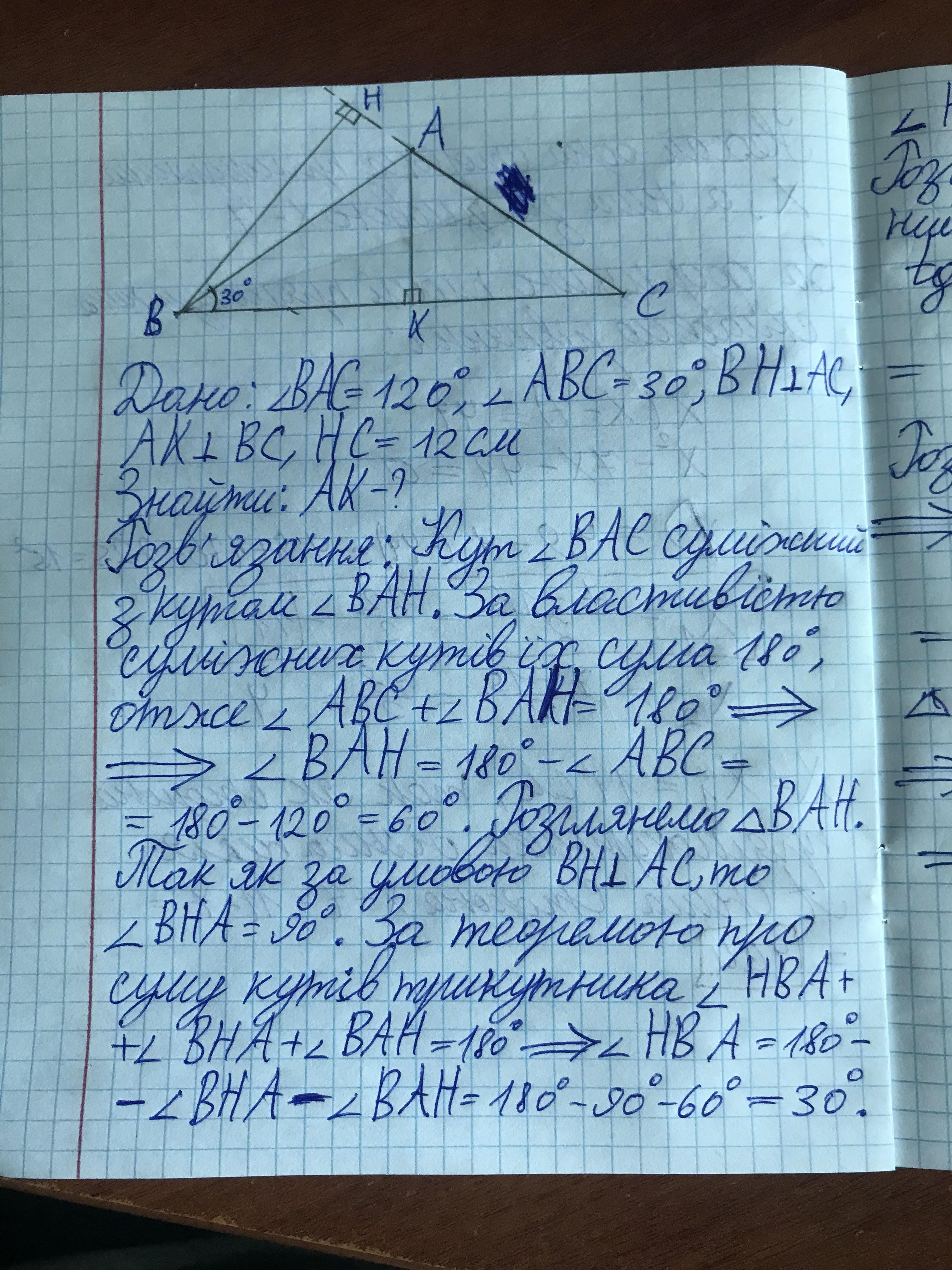 В трикутнику ABC кут В дорівнює 30°, кут А дорівнює 120°. Із вершини В
