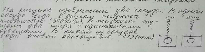 Объяснение: Если шары имеют и одинаковую массу, то в сосуде с водой показания динамометра будут меньшими, так как сила Архимеда в воде в 2 раза больше, чем в жидкости с плотностью 500кг/м³