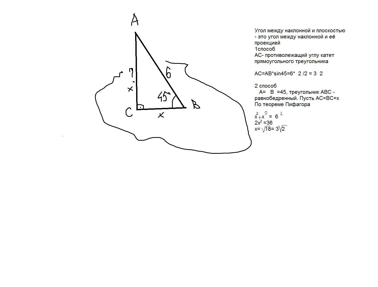 из точки A проведены к плоскости перпендикуляр и наклонная угол между наклонной и плоскостью 45 найдите длину перпендикуляра если длина наклонной 6 см.