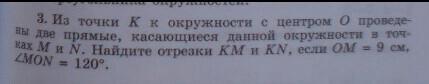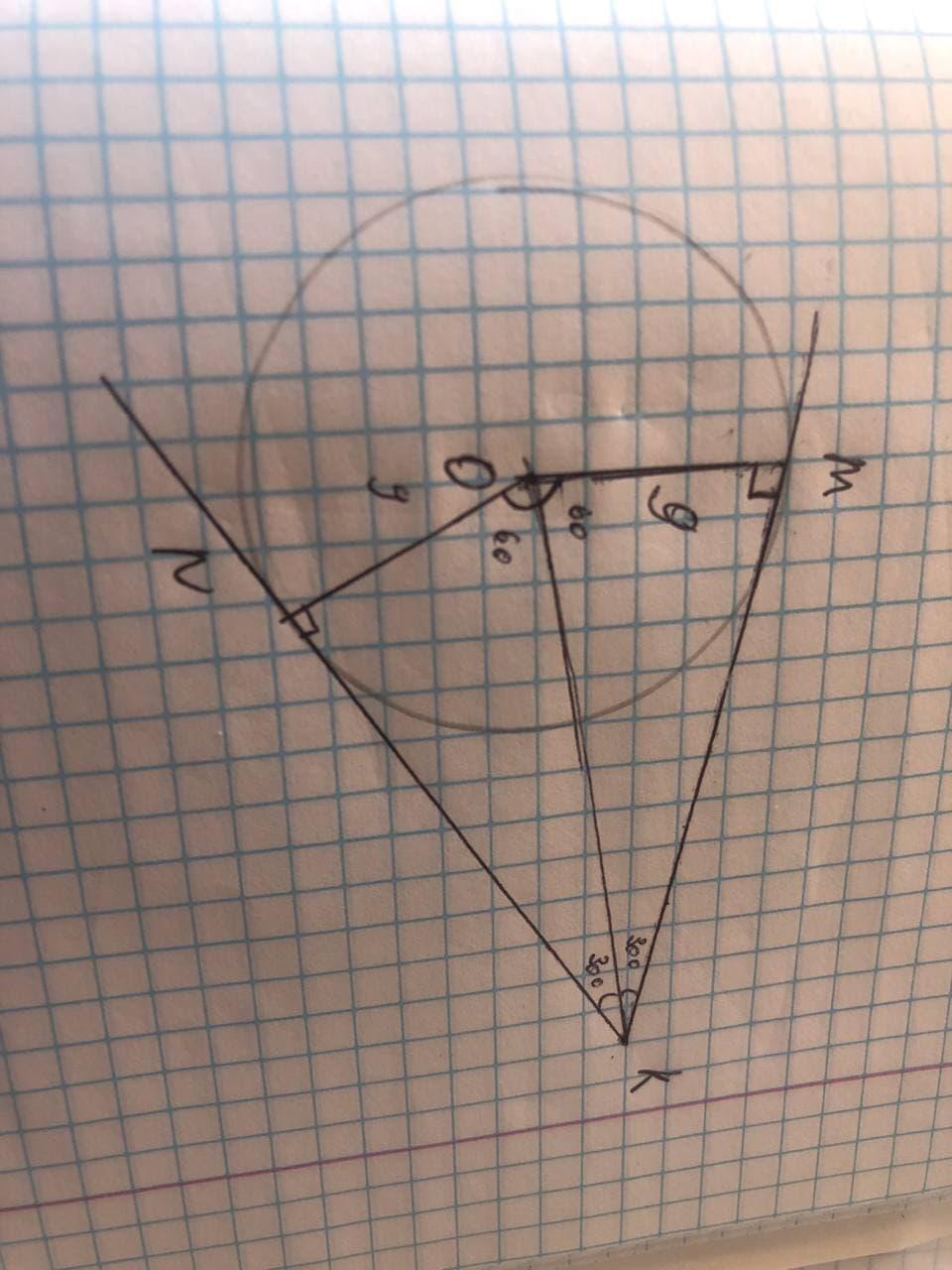 Объяснение: проведем OK заметим Прямые KM и KN являются касательными тогда выйдет что Δ-ки MOK и KON прямоугольные ; и так же они равны так как одна сторона у них общая (это гипотенуза) ; и так как радиусы равны то меньшие катеты тоже равны (так как они я являются радиусами ) теперь рассмотрим углы MON и КON нам известно что в сумме они дают 120° ; и так то что они равны(так как Δ-ки MON и KON равны ) . Тогда выйдет что MON=60° ; KON=60° . Нам известно что MO=9=R теперь проведем OK заметим что у нас поучились треугольники с 30 ; 60 ; 90 гр у таких треугольников есть свойство. В треугольнике с 30,60,90 гр есть свойство наименьший катет А(противолежит углу 30 ) ; а другой катет (противолежит углу 60)A√3 а гипотенуза равна 2A ) В нашем же случае MO=r -это наименьший катет который противолежит углу в 30 тогда КN=KM=r√3=9√3