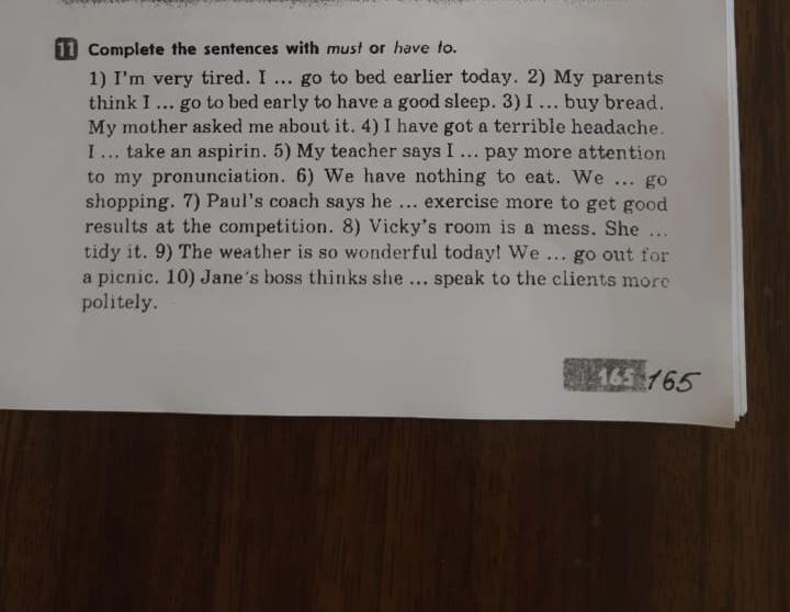 1) I'm very tired. I … go to bed earlier today. 2) My parents think I … go to bed early to have a good sleep. 3) I … buy bread. My mother asked me about it. 4) I have got a terrible headache I … take an aspirin. 5) My teacher says I … pay more attention to my pronunciation. 6) We have nothing to eat. We … go shopping. 7) Paul's coach says he … exercise more to get good results at the competition. 8) Vicky's room is a mess. She … tidy it. 9) The weather is so wonderful today! We go out for a picnic. 10) Jane's boss thinks she … speak to the clients more politely.