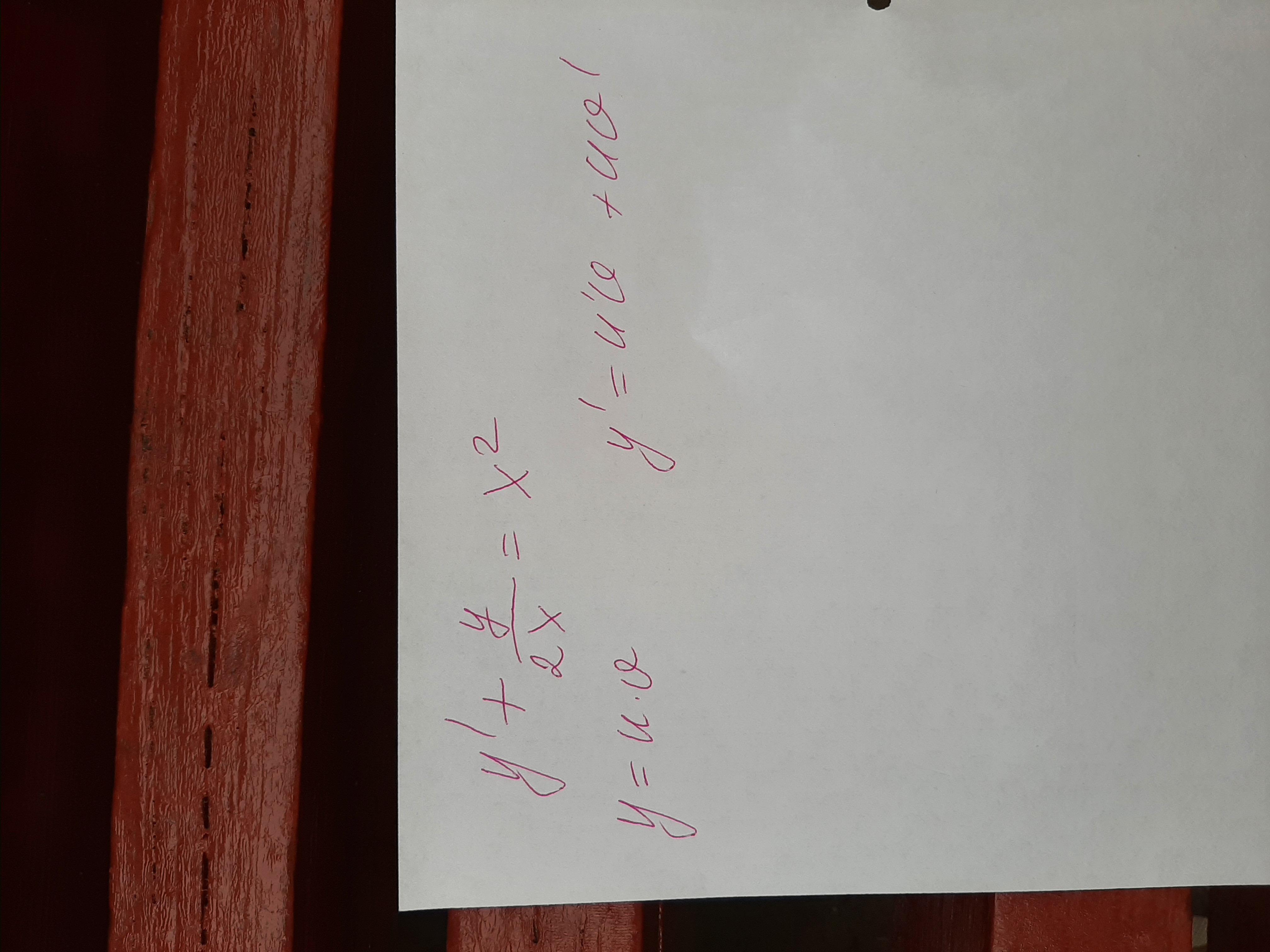\displaystyle y'+\dfrac{y}{2x}=x^2\\\\y=uv\ ,\ \ y'=y'v+uv'\\\\u'v+uv'+\frac{uv}{2x}=x^2\ \ ,\ \ \ \ u'v+u\, \Big(v'+\frac{v}{2x}\Big)=x^2\\\\a)\ \ v'+\frac{v}{2x}=0\ \ ,\ \ \ \int \frac{dv}{v}=-\int \frac{dx}{2x}\ \ ,\ \ ln|v|=-\frac{1}{2}\, ln|x|\ \ ,\ \ v=x^{-\frac{1}{2}}\\\\b)\ \ u'\cdot x^{-\frac{1}{2}}=x^2\ \ ,\ \ \frac{du}{dx}=x^{\frac{5}{2}}\ \ ,\ \ \int du=\int x^{\frac{5}{2}}\, dx\ \ ,\\\\u=\frac{2\, x^{\frac{3}{2}}}{3}+C\ \ ,\ \ u=\frac{2}{3}\sqrt{x^3}+C