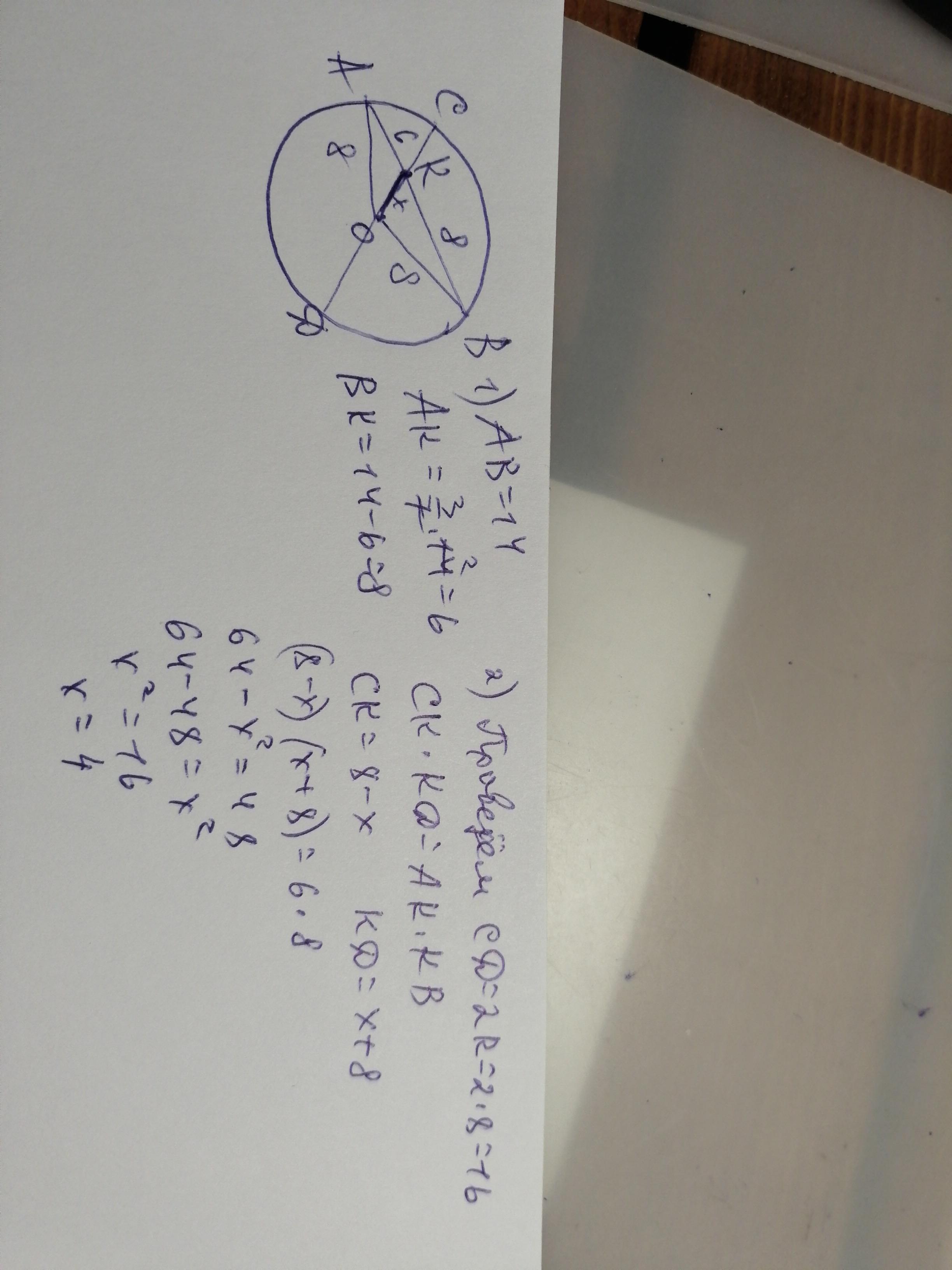 хорда аб длиной 14 делится точкой к в отношение 3:4.Радиус окружности 8 . Найти расстояние от точки К до центра окружности