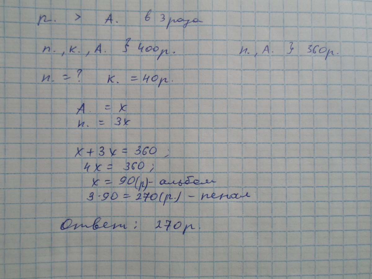 Школьный пенал дороже альбома в 3 раза .Пенал,карандаш и альбом стоят 400 рублей. Сколько стоит пенал,если цена карандаша 40 рублей.Выполни схему и реши задачу.