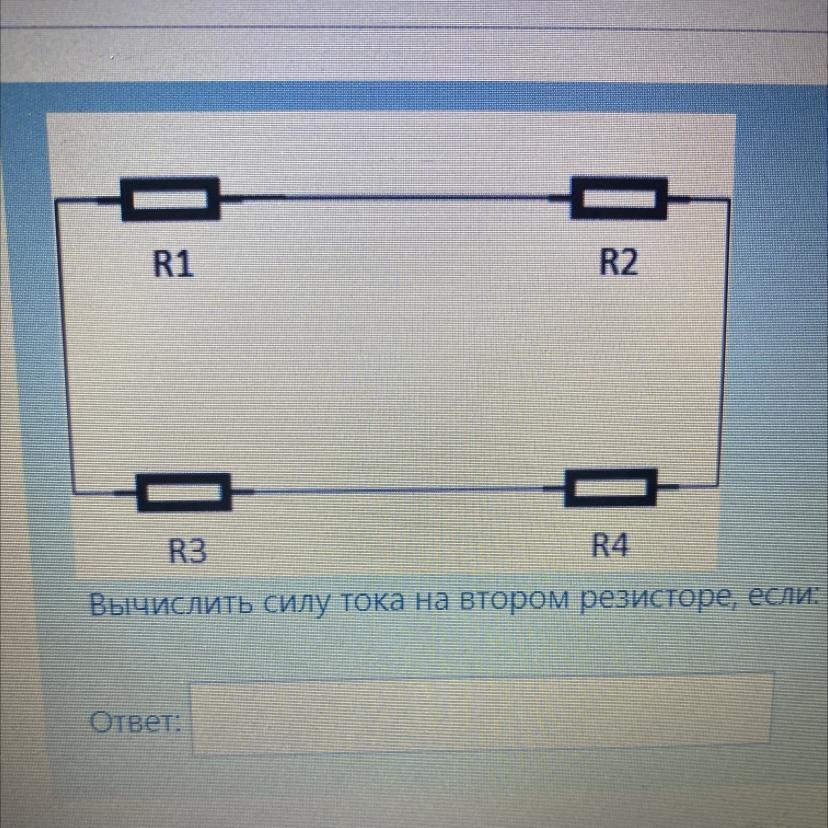 Вычислить силу тока на втором резисторе, если: R1=5 Ом, R2=3 Ом, R3=9Ом, R4=12 Ом, U3= 200В.