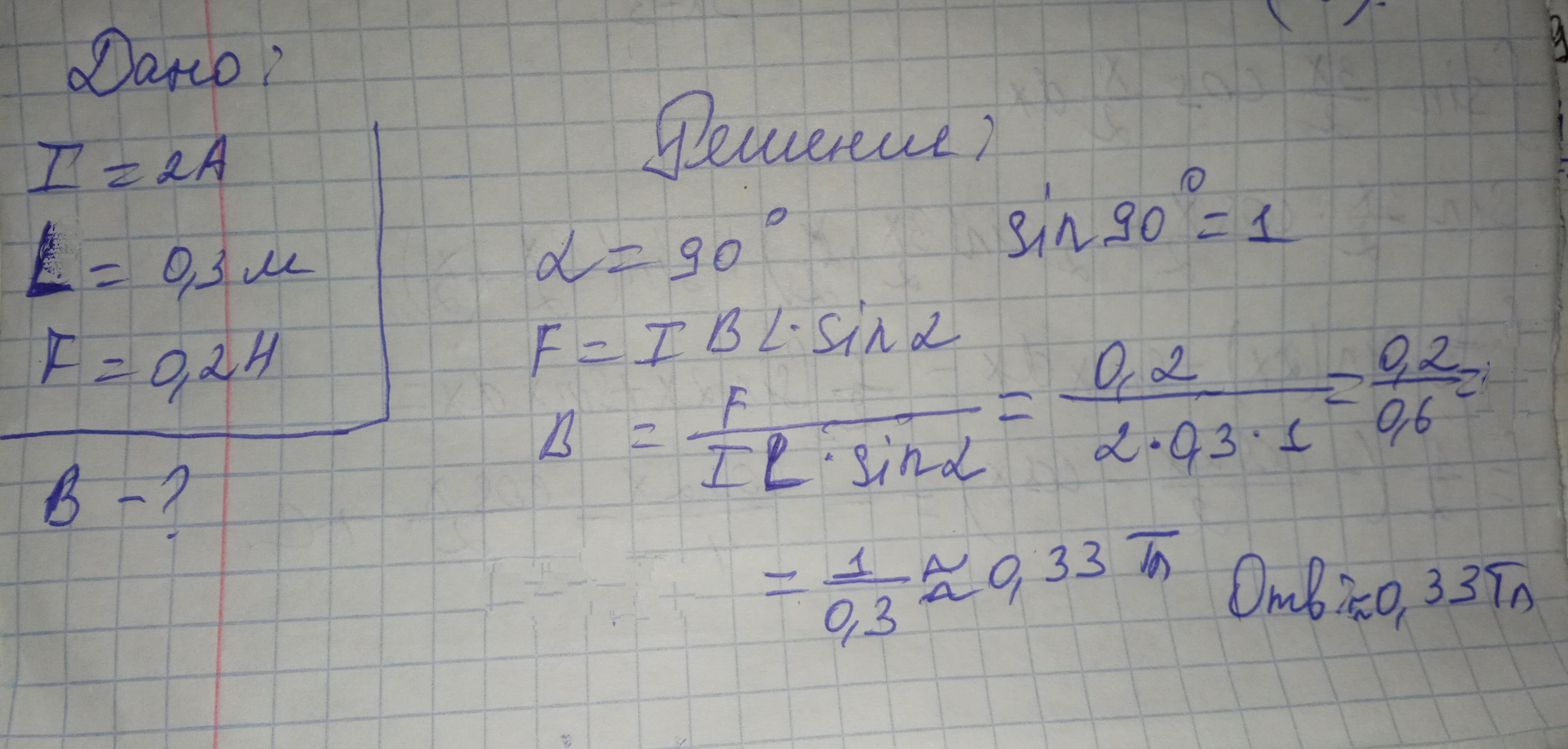 Задача на силу Ампера. Сила тока в проводнике 2А, длина активной части проводника 0,3м, магнитное поле, действует на проводник с силой 0,2Н. Определите индукцию магнитного поля, если линия индукции поля и ток взаимно перпендикулярны.