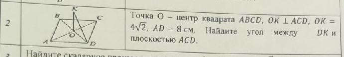 Точка O - Центр квадрата ABCD, OK ⟂ ACD, OK = 4√2 AD=8см. Найдите угол между DK и плоскостью ACD