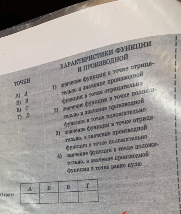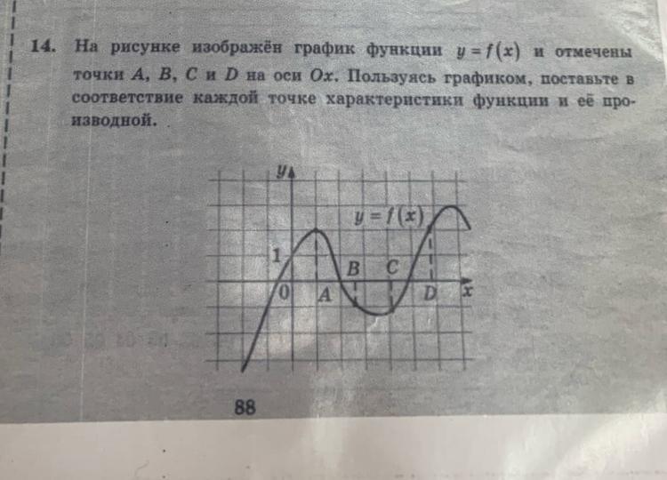 Пользуясь графиком, поставьте в соответствие каждой точке характеристики функции и её производной.