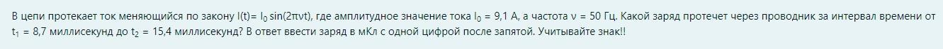 В цепи протекает ток меняющийся по закону I(t)= I0 sin(2πνt), где амплитудное значение тока I0 = 9,1 А, а частота ν = 50 Гц. Какой заряд протечет через проводник за интервал времени от t1 = 8,7 миллисекунд до t2 = 15,4 миллисекунд?