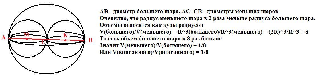 В шар вписаны два одинаковых шара. Определить отношение объемов вписанного шара к внешнему. Пожалуйста сделайте 35б