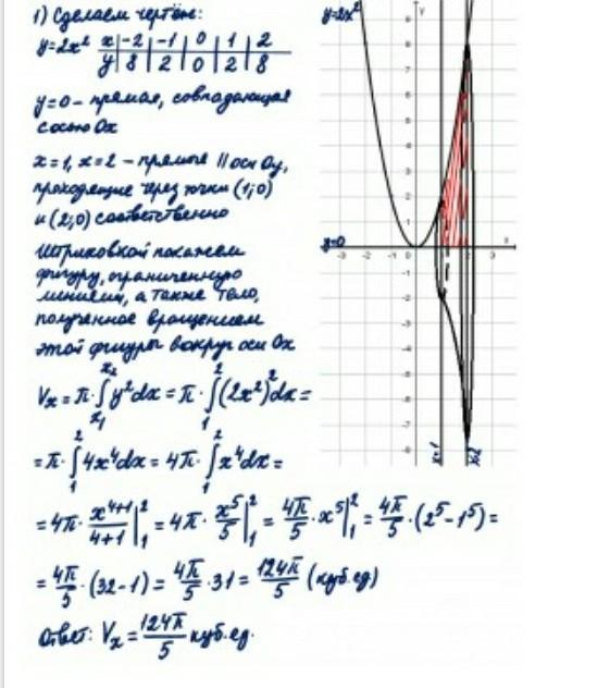 Найдите объем тела, полученного при вращении параболы y=2x^2 от точки x=1 до точки x=2 вокруг оси абсцисс V=24,8р