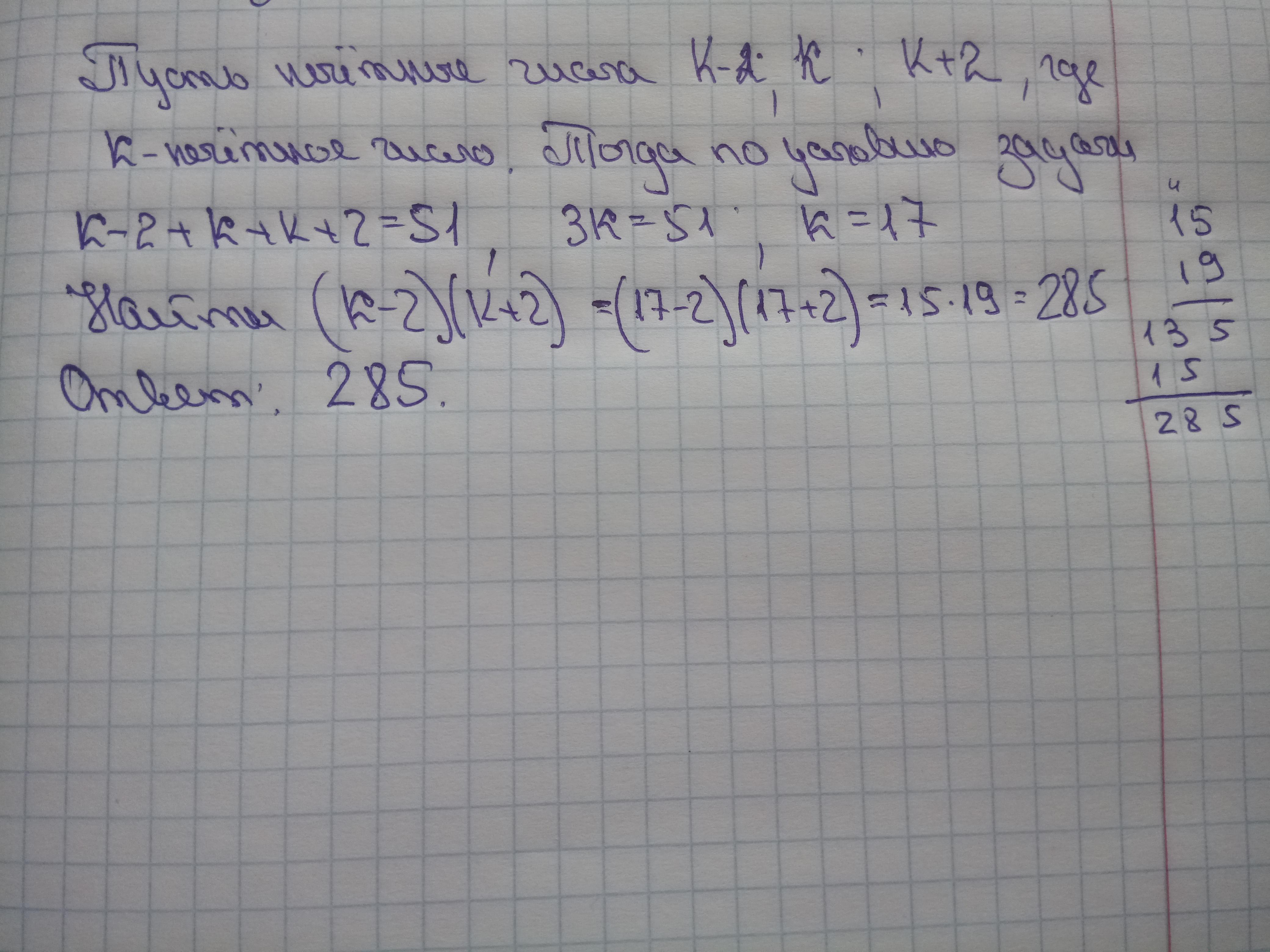 сумма трёх нечётных чисел равна 51.Найдите произведение наибольшего и наименьшего из этих чисел