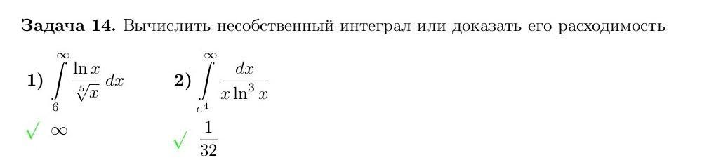 lnx = t => dt=dx/x =>I = int(от 4 до +inf) dt/t^3 = 1/(2t^2) | (от +inf до 4) = |второе слагаемое =0, т.к. 1/(t^2) -> 0 при t-> inf)| = 1/(2*4^2) = 1/32.