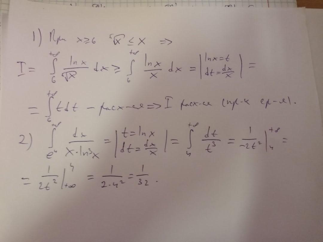 x^(1/5)<=x при x>=6, откуда 1/x^(1/5)>=1/x. Значит int(lnx/x^(1/5)) (от 6 до +inf) >= int (lnx/x) (от 6 до +inf). Замена lnx = t => dt=dx/x => int (lnx/x) (от 6 до +inf) = int t*dt (от ln(6) до +inf) = +inf - расходится, по признаку сравнения расходится и исходный
