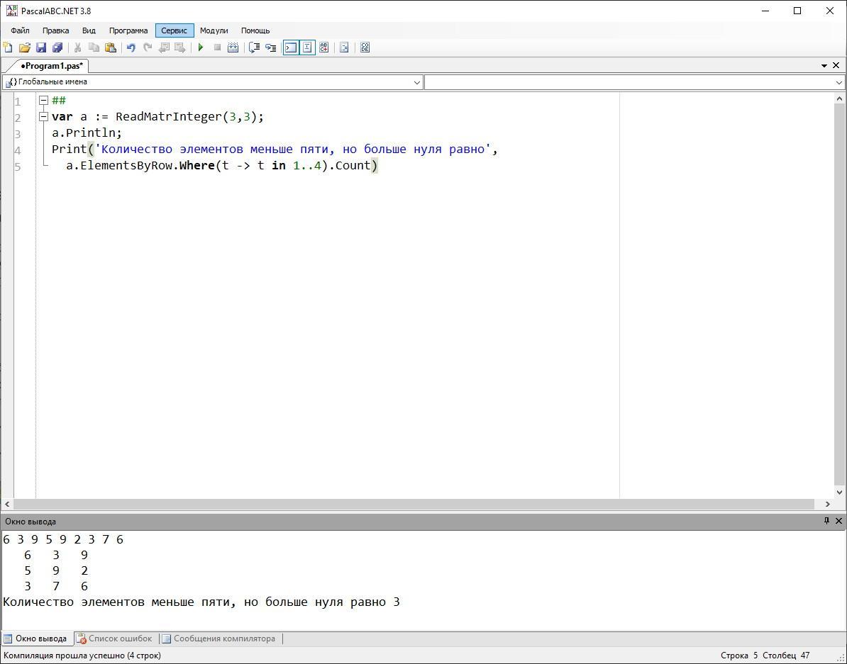 Print('Количество элементов меньше пяти, но больше нуля равно',