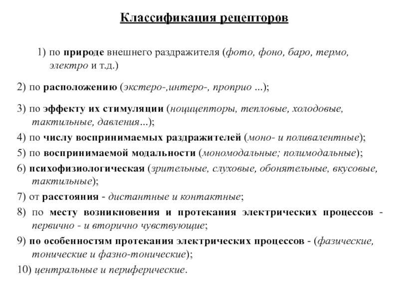 Опишите классификацию рецепторов по их строению (5 типов), по типу воспринимаемых раздражителей, по месту возникновения нервного импульса.