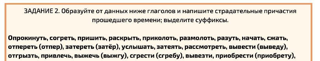 Опрокину⍑ый, согре⍑ый, приши⍑ый, раскры⍑ый, приколо⍑ый, размоло⍑ый, разу⍑ый, нача⍑ый, сжа⍑ый, όтпер⍑ый, затёр⍑ый, услышанный, затеянный, рассмотренный, выведенный, отгрызенный, привлеченный, выжженный, сгребенный, вывезенный, приобретенный.