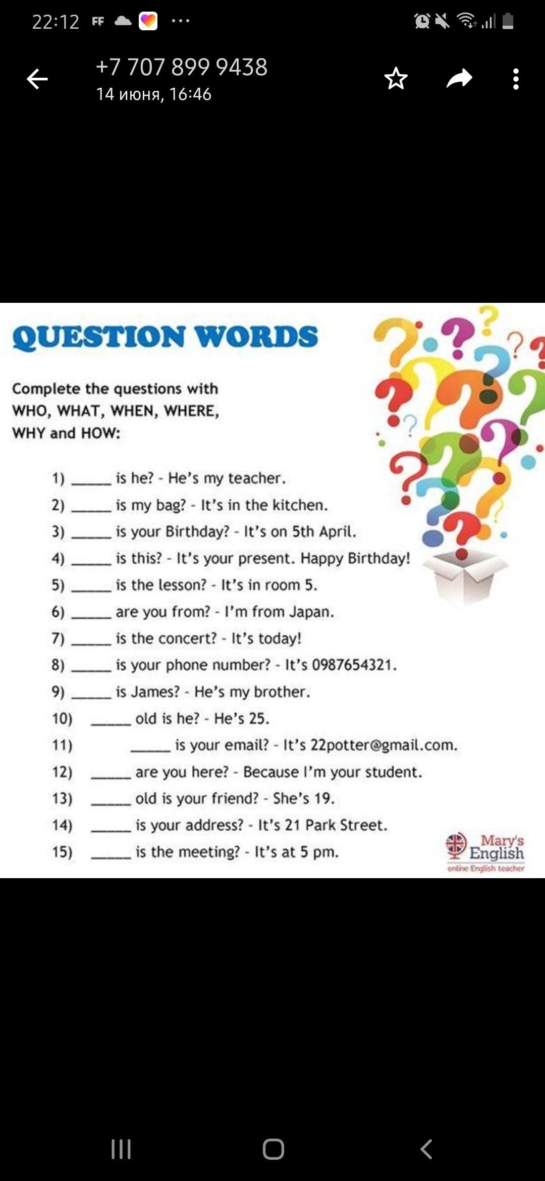 QUESTION WORDS Complete the questions with WHO, WHAT, WHEN, WHERE, WHY and HOW: 1) is he? - He's my teacher. 2) is my bag? - It's in the kitchen. is your Birthday? - It's on 5th April. is this? - It's your present. Happy Birthday! is the lesson? - It's in room 5. 3) 4) 5) 6) are you from? I'm from Japan. 7) is the concert? - It's today! is your phone number? - It's 0987654321. is James? - He's my brother. 8) 9) 10) old is he? - He's 25. 11) is your email? - It's 22potter@gmail.com. 12) are you here? - Because l'm your student. 13) old is your friend? She's 19. 14) is your address? - It's 21 Park Street. is the meeting? - It's at 5 pm. 15)
