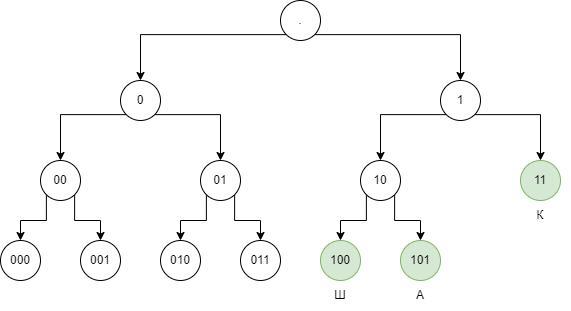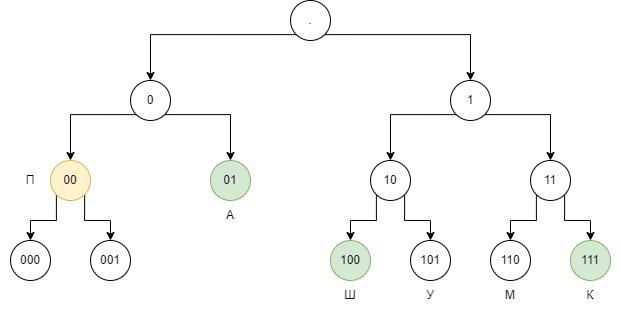 Коды А, Ш, К известны (01, 100 и 111 соответственно). Осталось распределить коды букв П (эта буква встретится в ПАМПУШКА дважды), У и М. Оптимальный вариант — П выделить двухсимвольный код (00), У и М — трехсимвольные (в каком-то порядке 101 и 110). Очевидно, другие варианты лишь увеличат длину кода: кодовое слово длины 2 осталось только одно, остальные будут длины не меньше 3.