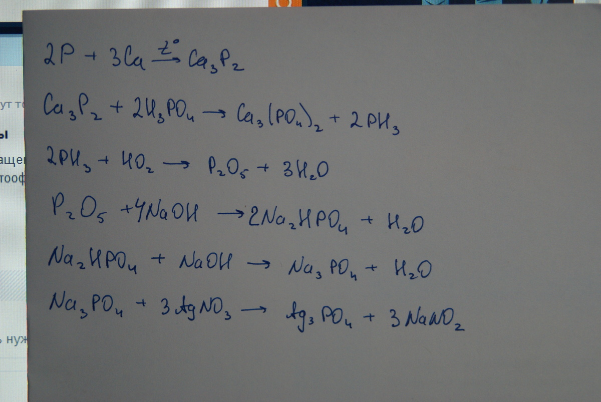 составьте уравнение реакций схемы превращений: фосфор-фосфид кальция-фосфин-оксид фосфора-гидроортофосфат натрия-ортоофосфат натрия-ортофосфат серебра