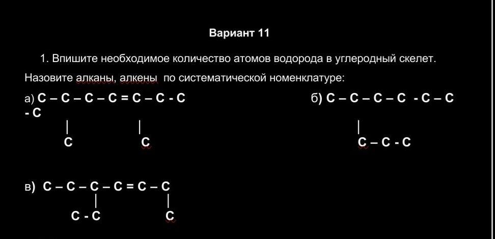 Впишите необходимое количество атомов водорода в углеродный скелет. Назовите алканы, алкены по систематической номенклатуре:
