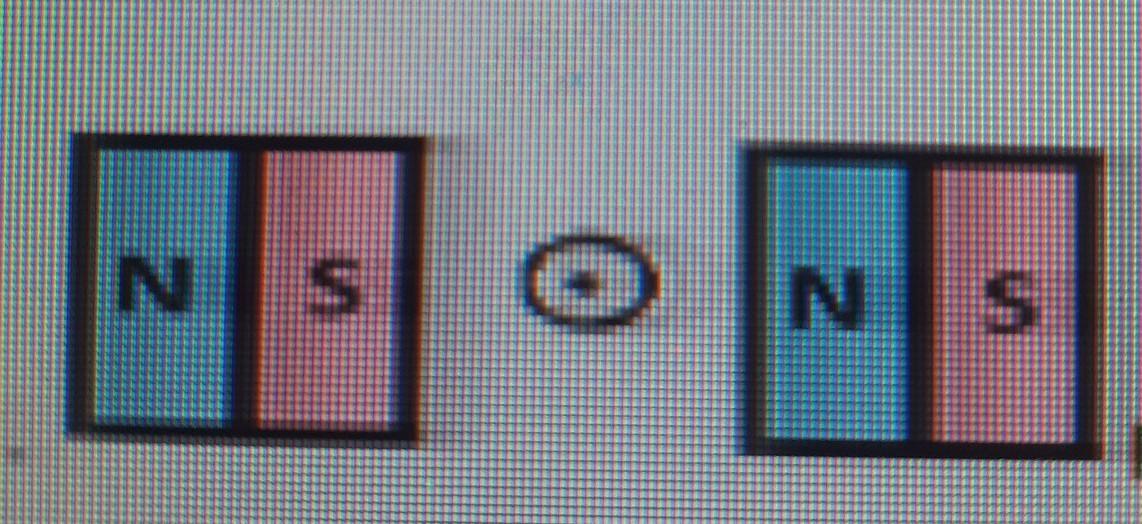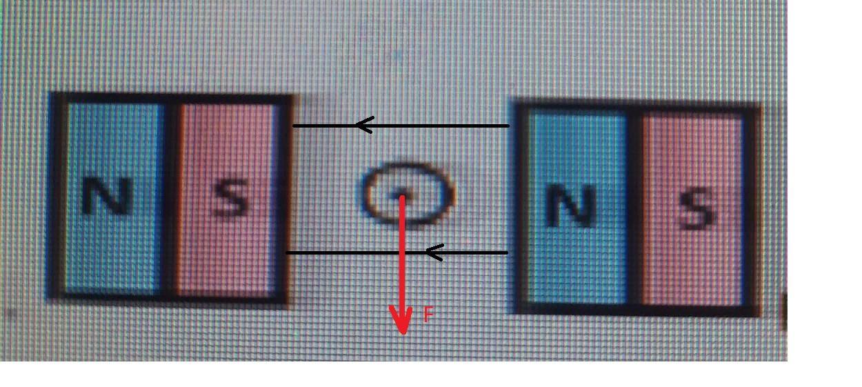 На рисунке представлено магнитное взаимодействие с током. Направление тока в проводнике обозначено точкой. Определите направление силы действующей на проводник.