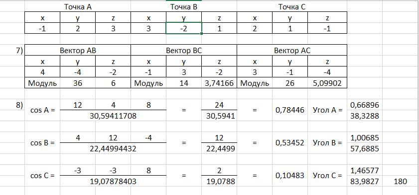 cos B = (-4*(-1) + 4*3 + 2*(-2)) / (6*√14) = 12 / 22,44994432 =