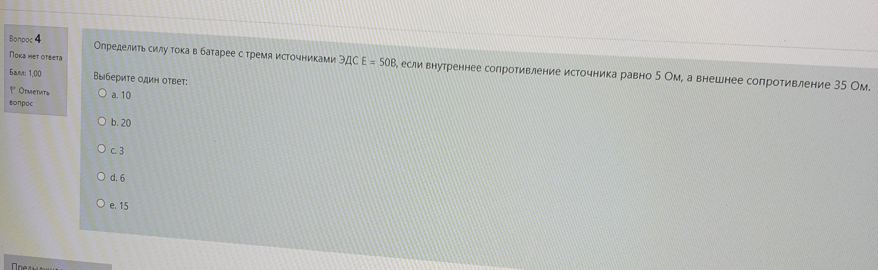 I = ЭДС / (R + r) = 150 / (35 + 15) = 3 А