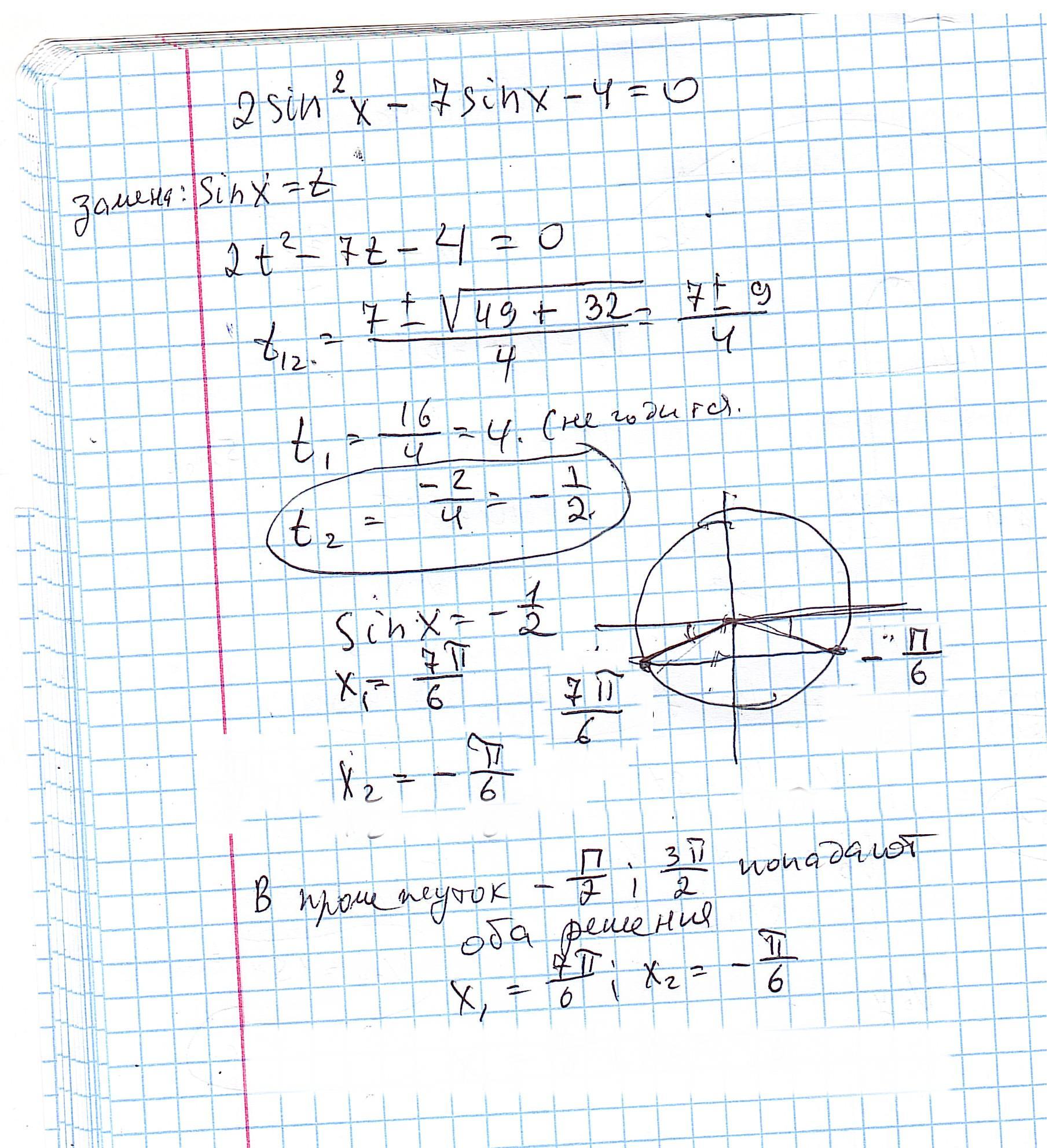 решить уравнение 2sin^2x-7sinx-4=0 Найти корни на отрезке [-п/2; 3п/2]