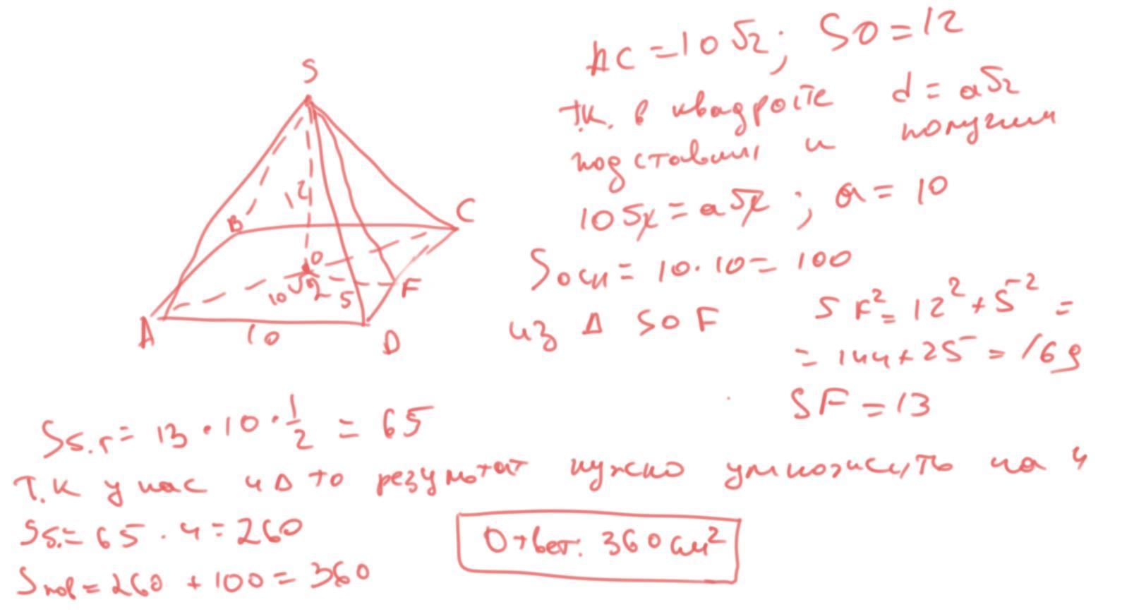 помогите пожалуйста! найдите площадь поверхности правильной четырёхугольной пирамиды диагональ основания которой равна 10√2 см и высота равна 12 см