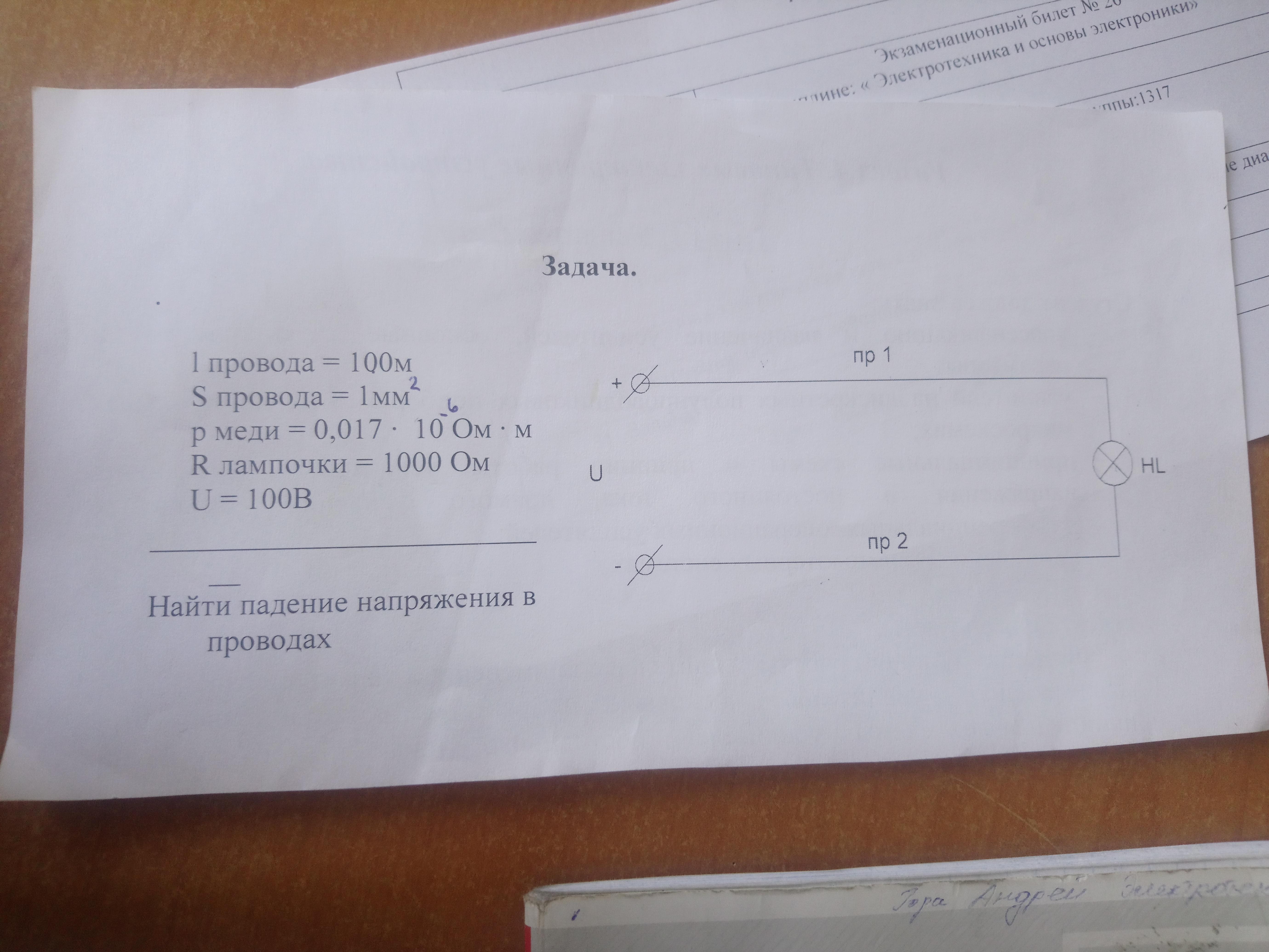 2*0.017*100/1= 3.4 Ом, общее сопротивление R= Rл+Rпр=1003.4 Ом, ток I=U/R=100/1003.4 A, падение в проводах Rпр=I*Rпр= 100*3.4/1003.4= 0.339 В