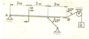 2. Определить реакции связей стержня АВ изображенного на рисунке, если на него действует пара сил М=30 кН∙м, вес стержня 20 кН, вес груза Q=25 кН.