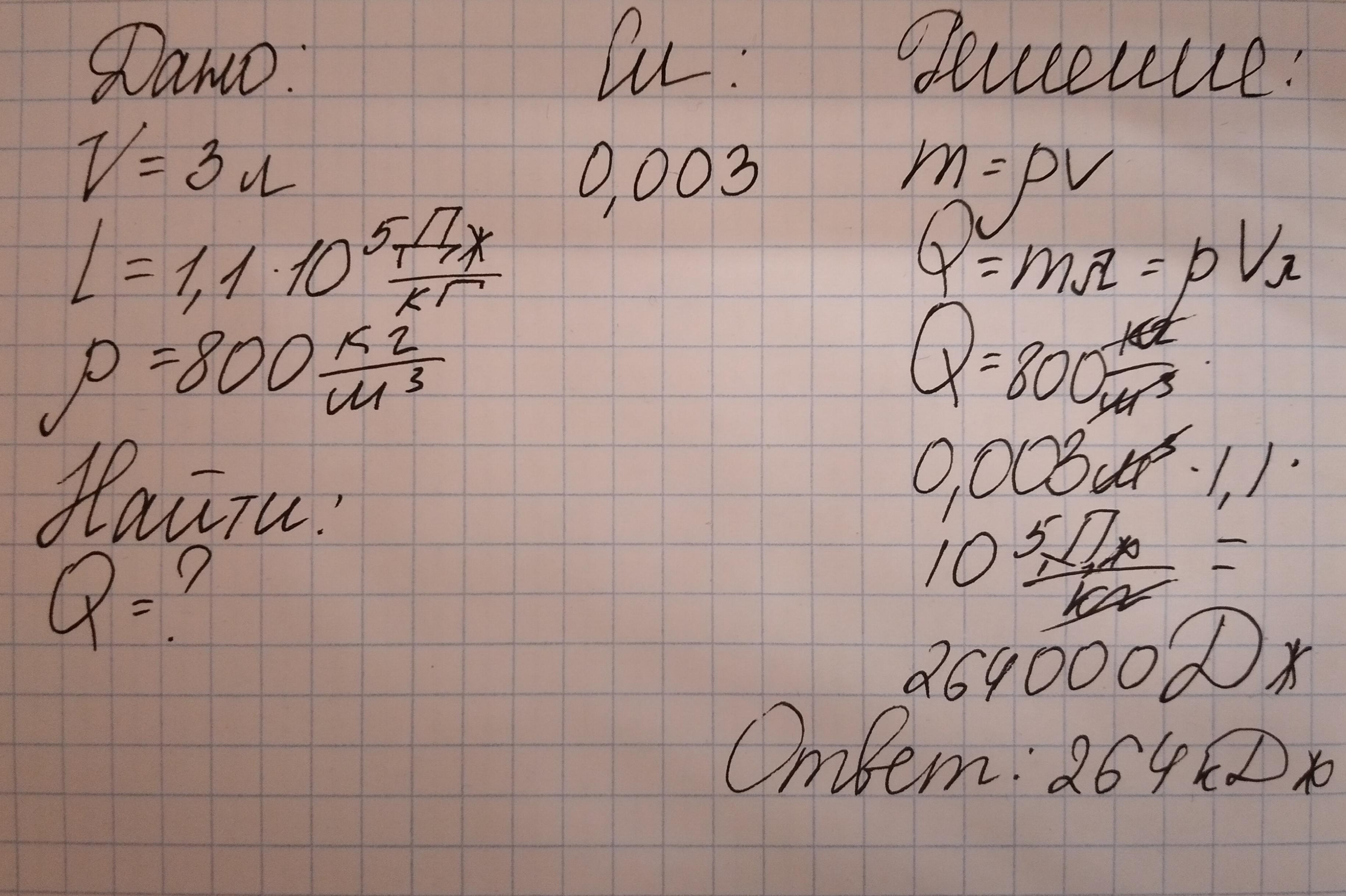 --Определи, какое количество теплоты выделится при кристаллизации 3 л жидкого спирта. Удельная теплота Кристаллизации жидкого спирта равна 1,1⋅105 Дж/кг, плотность жидкого спирта — 800 кгм3.